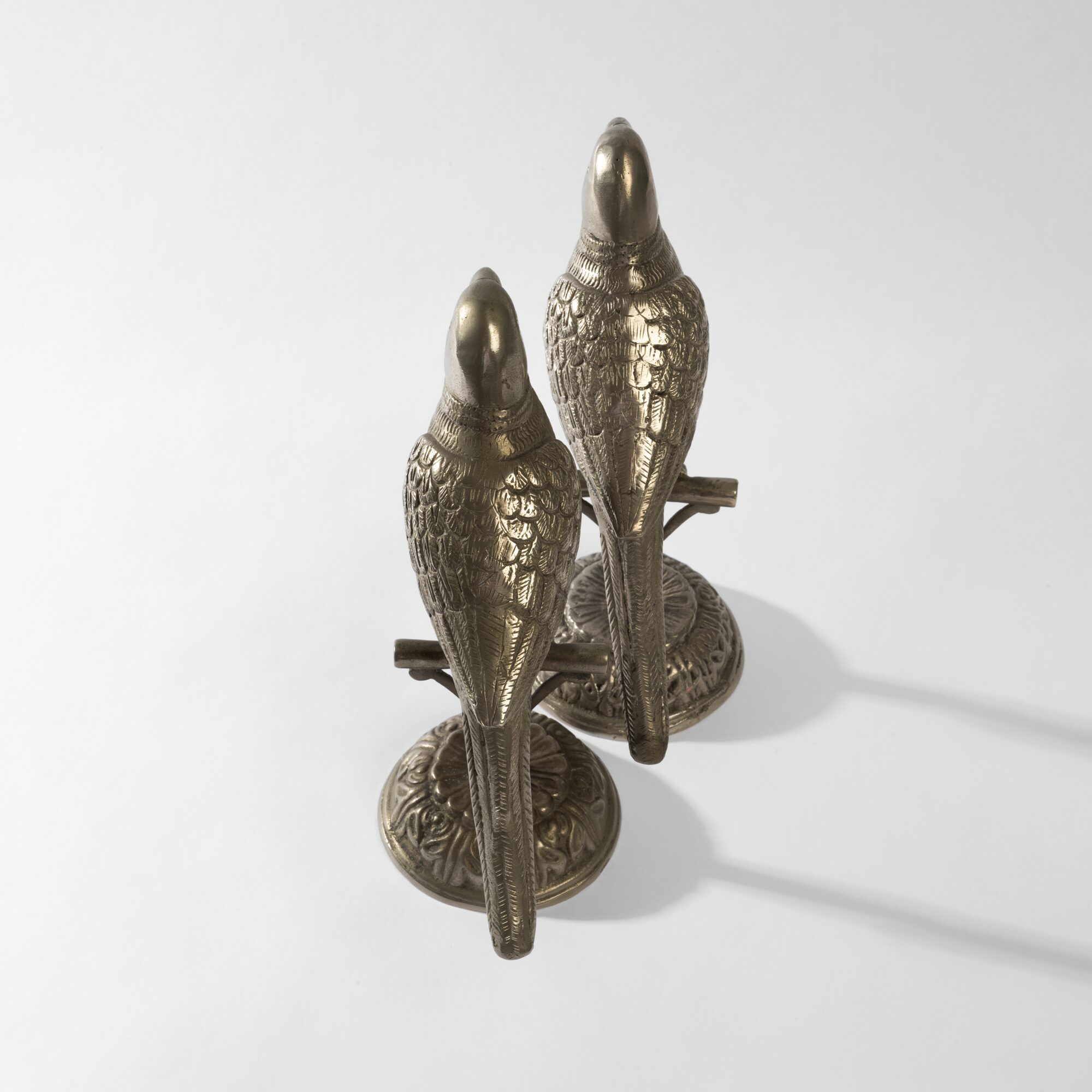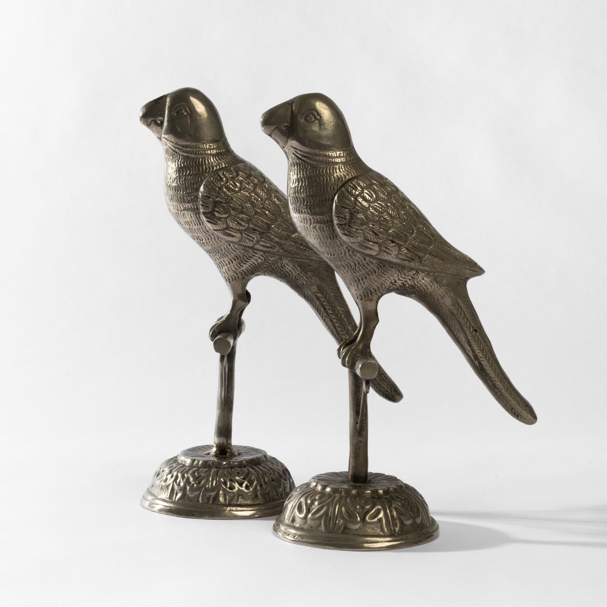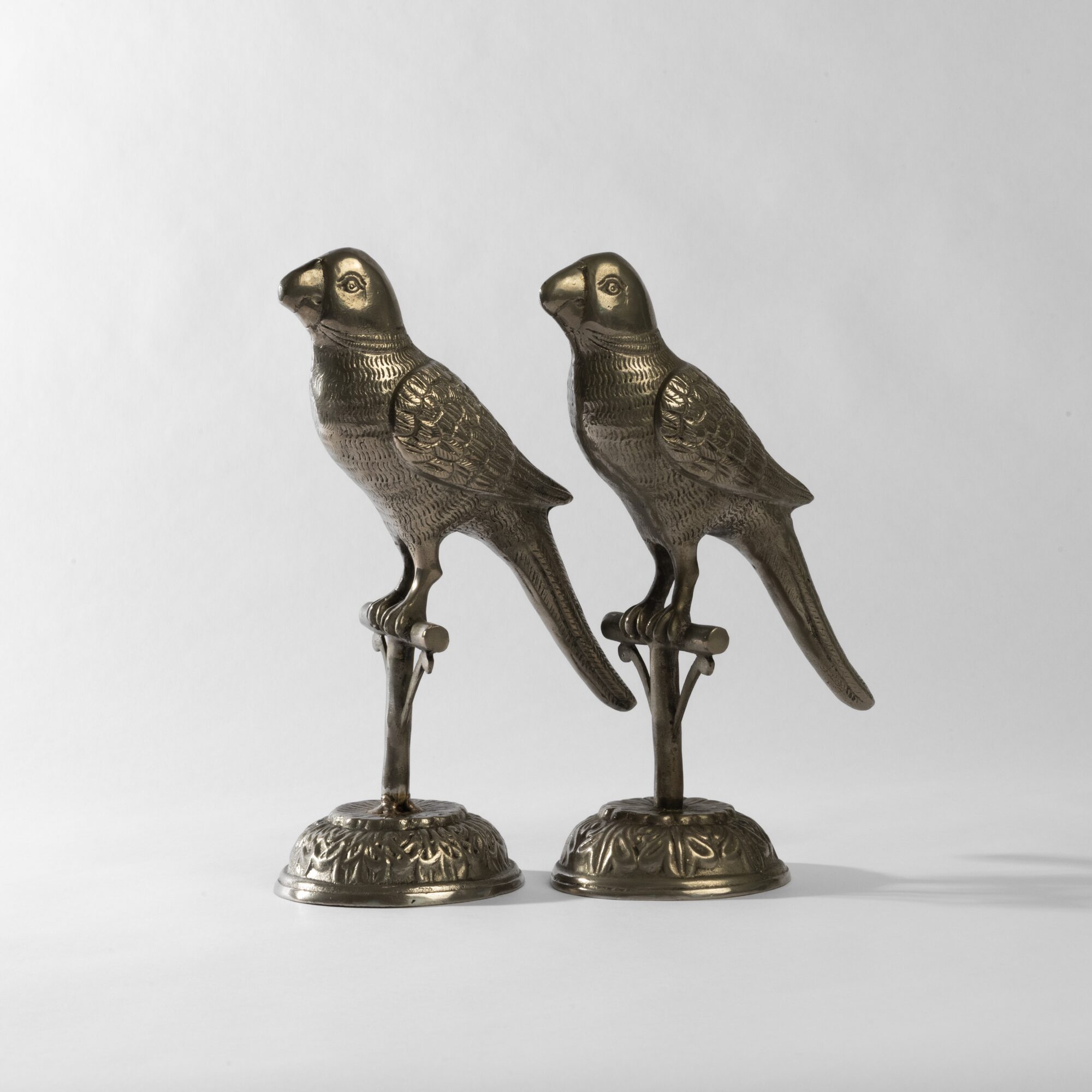 A pair of vintage parrots, meticulously crafted from zinc or a comparable metal, embody timeless elegance and charm. These handcrafted treasures lend an air of sophistication, making them a striking addition to any space.