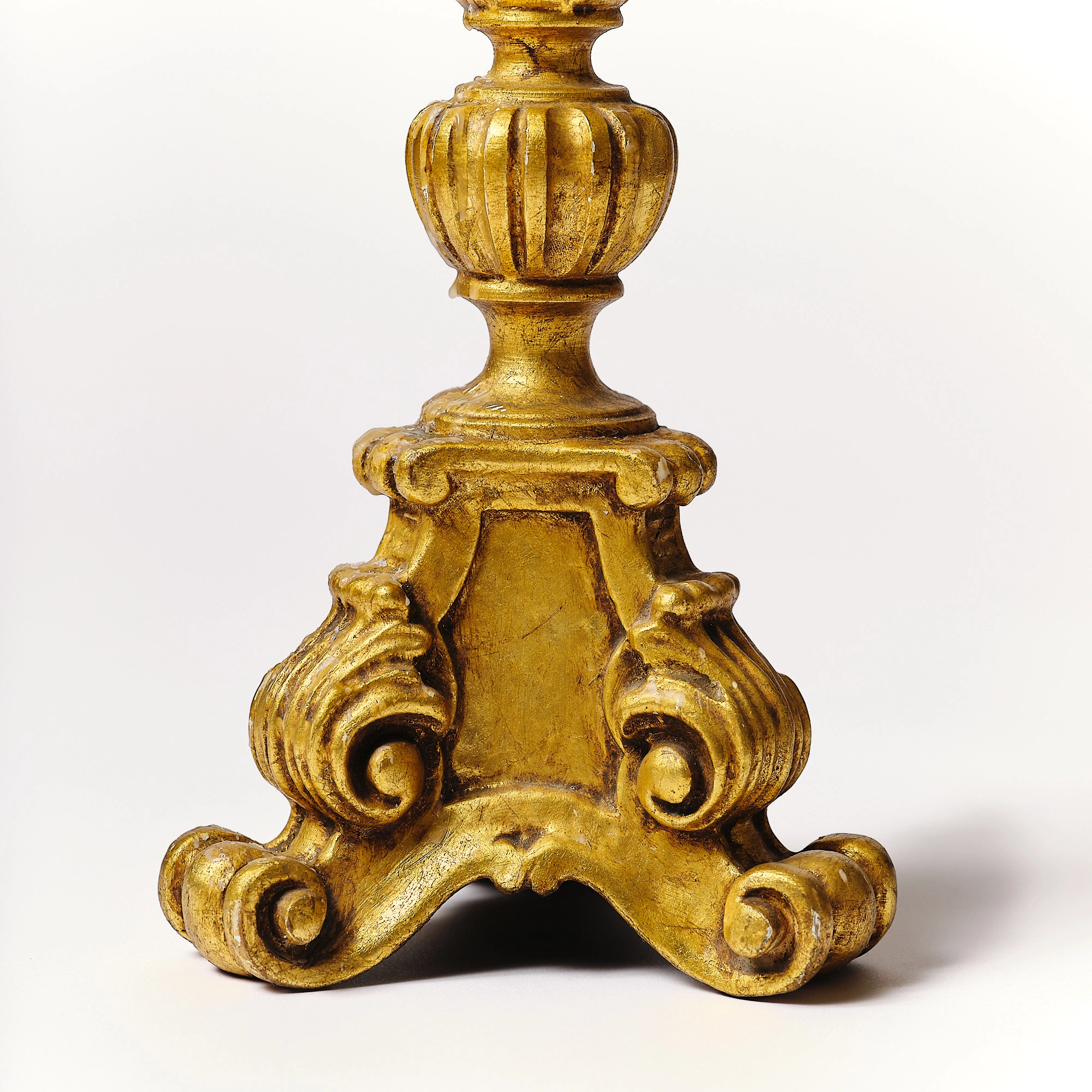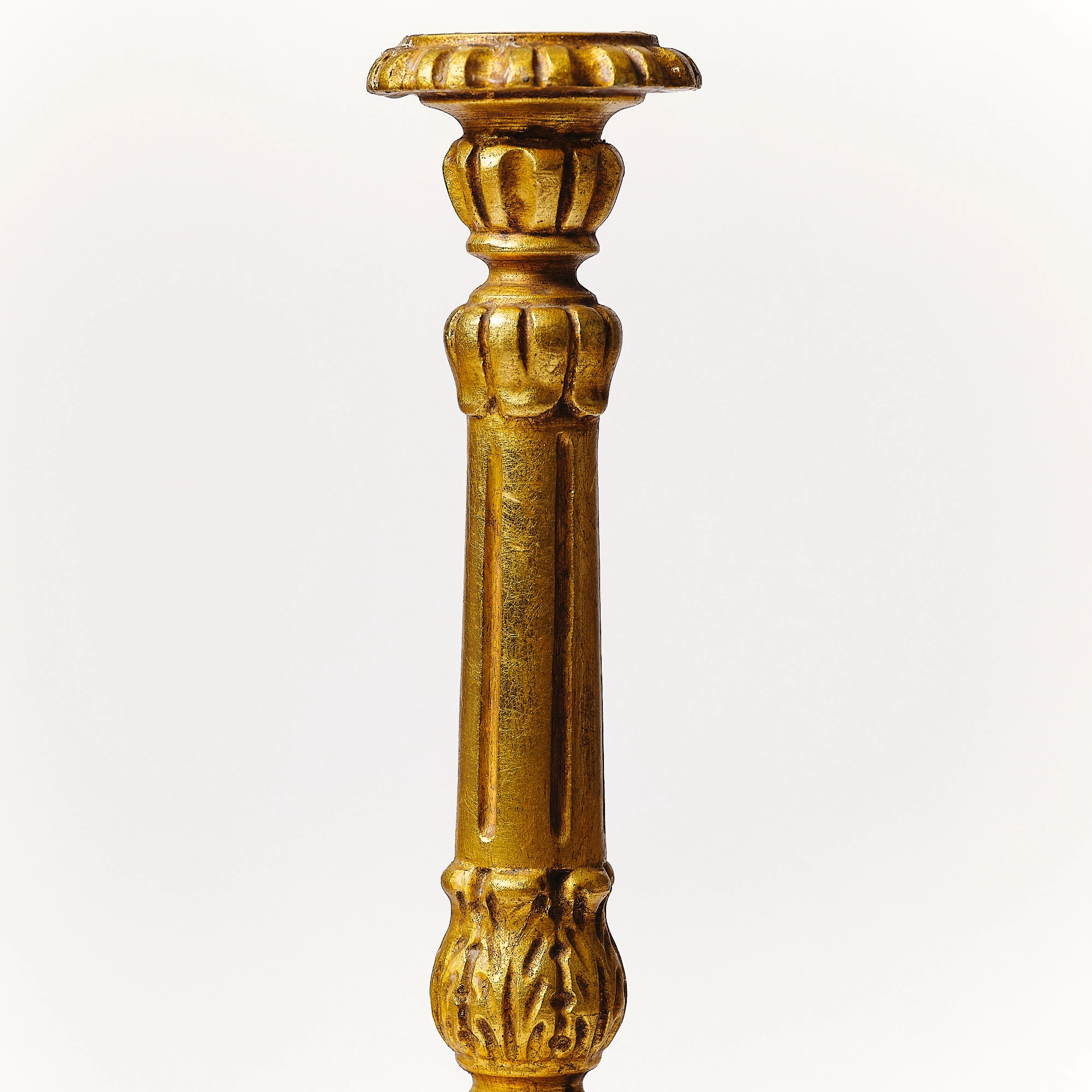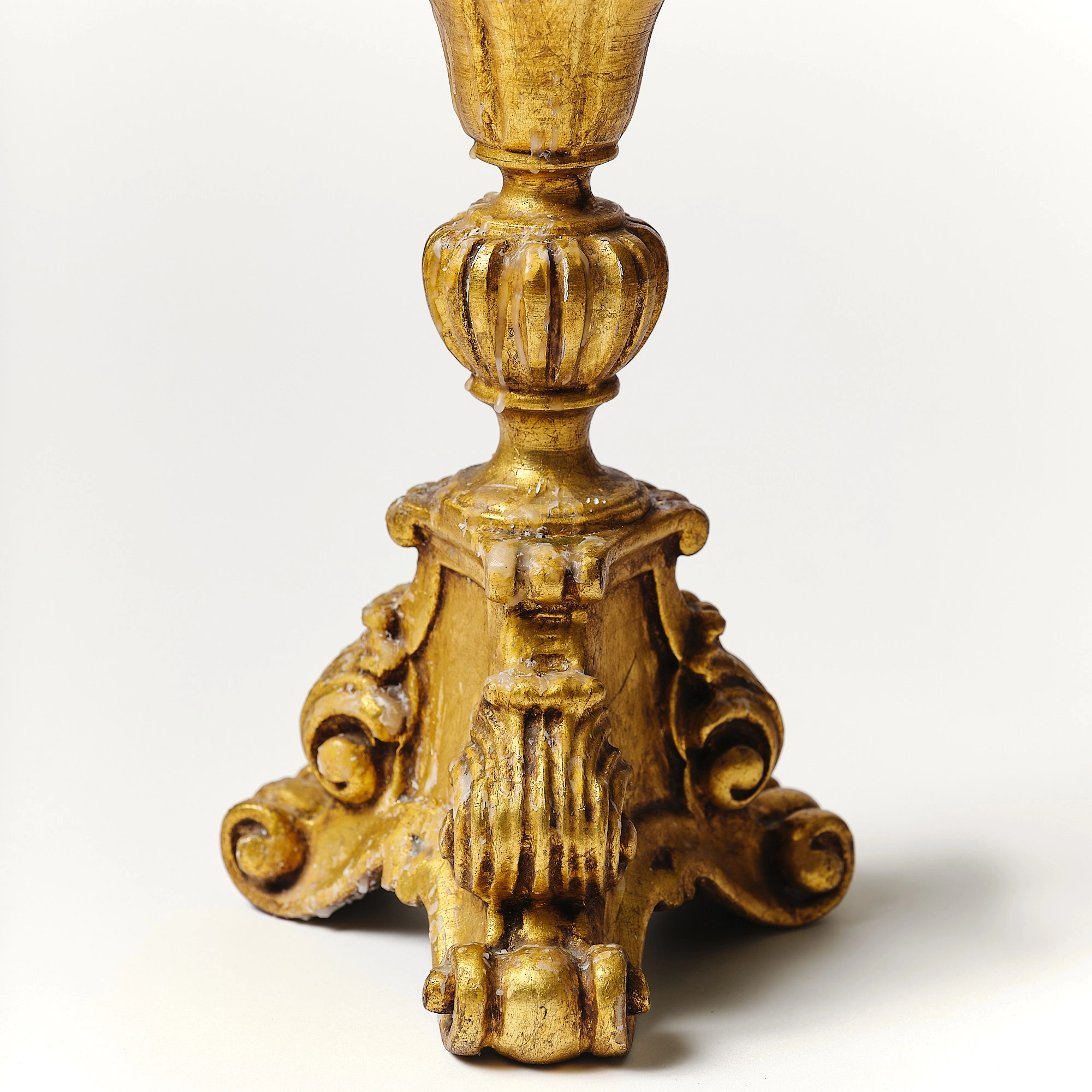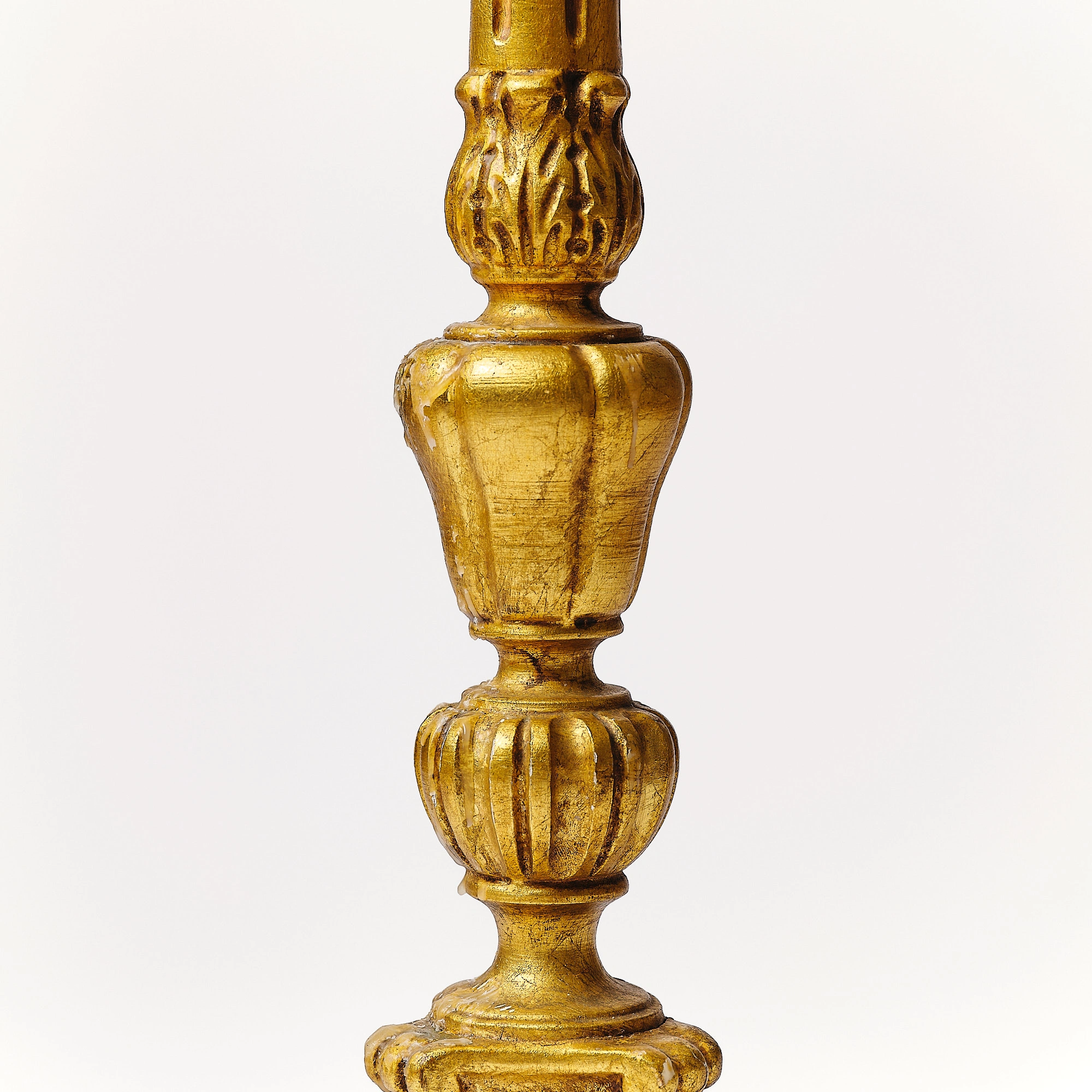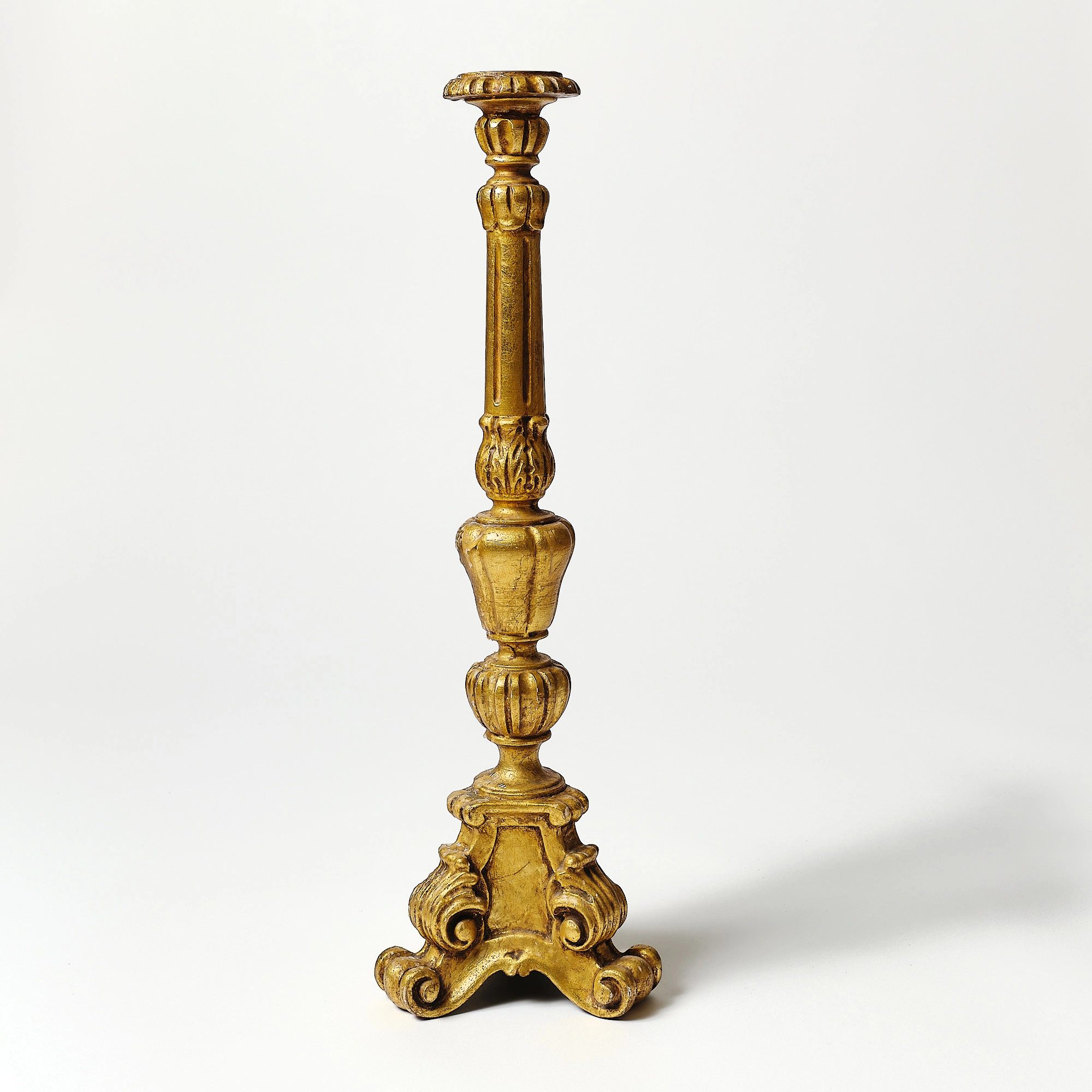 An elegant carved gilt wood candlestick. These is some residue of wax which we haven’t removed to allow the original gilt to be retained. If needed by a client this can be restored to pristine condition