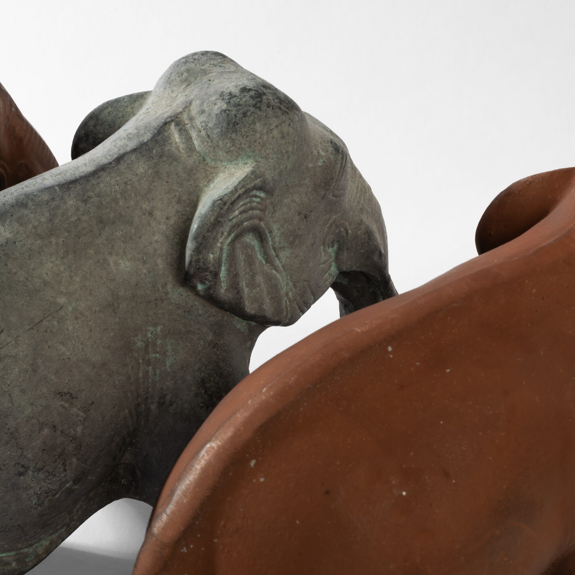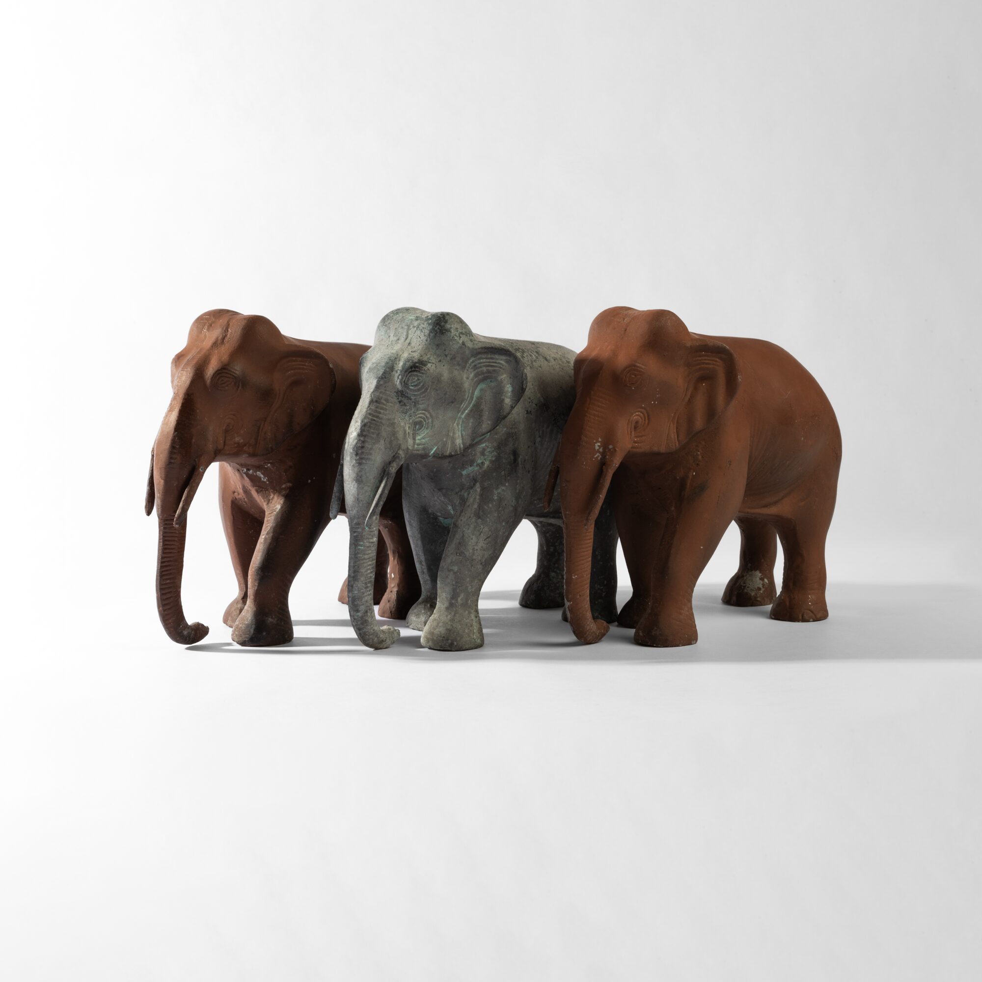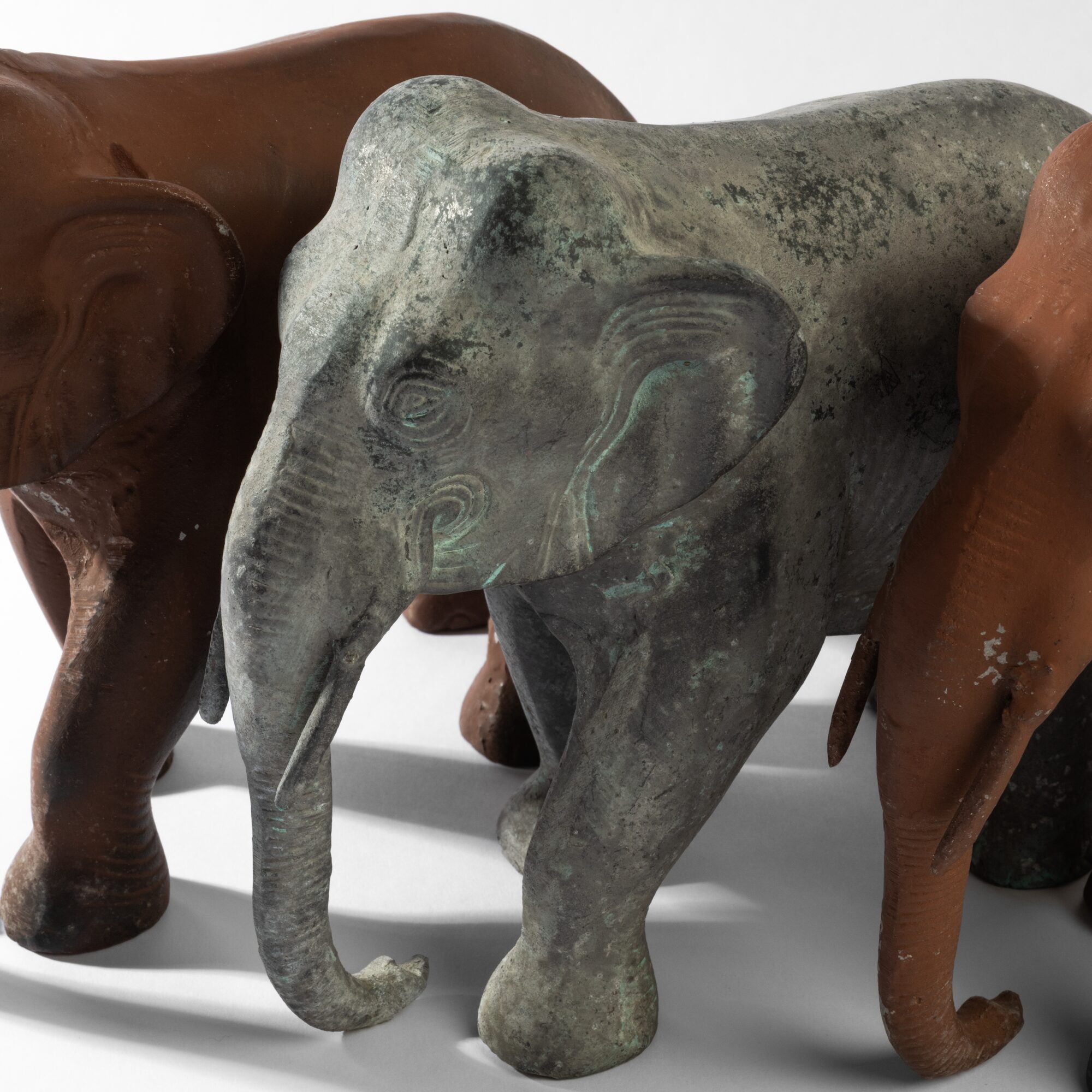These vintage metal elephant sculptures are full of charm and character. A beautifully aged patina, they have a striking form and structure. These pieces are not only visually stunning but also strong and stable.